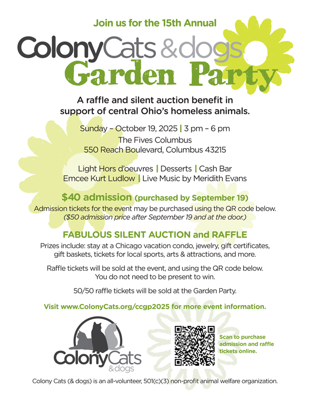 Purchase raffle tickets by mail: Print the Garden Party RSVP card, fill in the quantity of raffle tickets you would like to purchase, and mail it with your payment to: Colony Cats – P.O. Box 163904, Columbus OH 43216-3904. Click here to download and print the Garden Party RSVP card.
